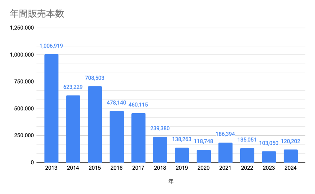 まずはこちら、直近12年の年間販売本数です。