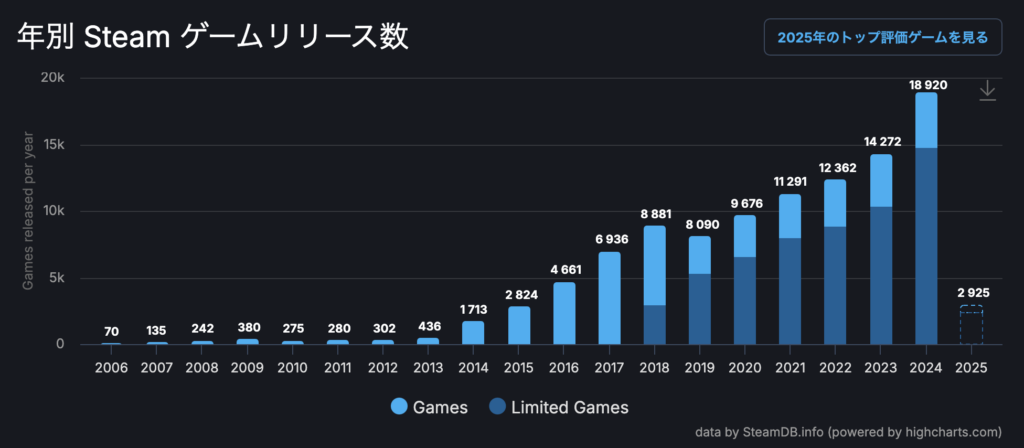 Steamでリリースされるゲームは年々増えており、2024年だけで18,920本の新規ゲームがリリースされました。